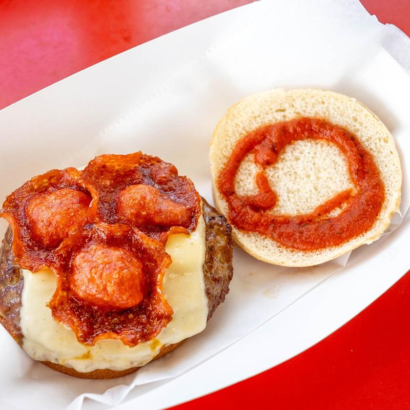 3 4Oz patties stack high and 3 slices of cheese with you choose of toppings